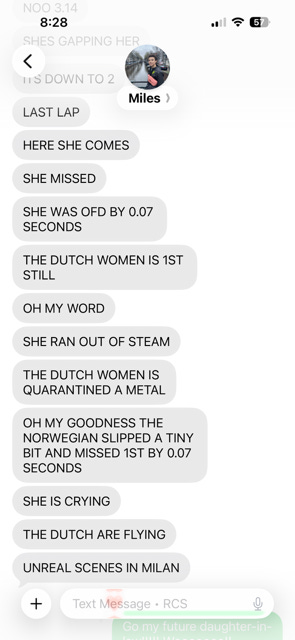 Occasionally they raise some very real questions about both his spelling prowess and his ability to discern when his mother might require more information. For example, here is a text I received during the Olympics, when he got deeply into speed skating for a week: