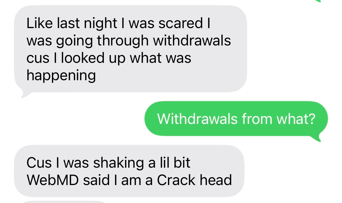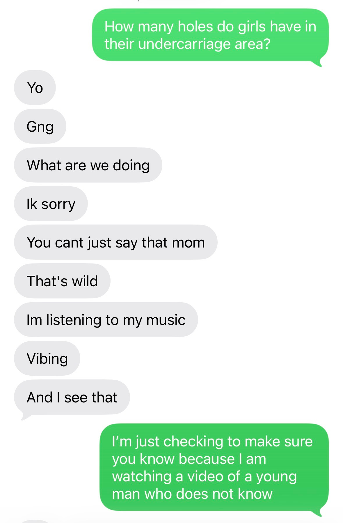Texting also allows me to mildly traumatize him from time to time, like when there is a discussion on Threads about the lack of male understanding of women’s bodies.