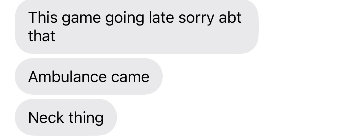 And here is a slightly less information text he sent while working as a student manager for his high school’s hockey team: